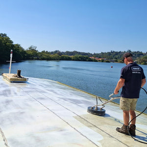 - Wash or water-blast the entire houseboat roof or deck surface to remove dirt, debris, and old coatings.